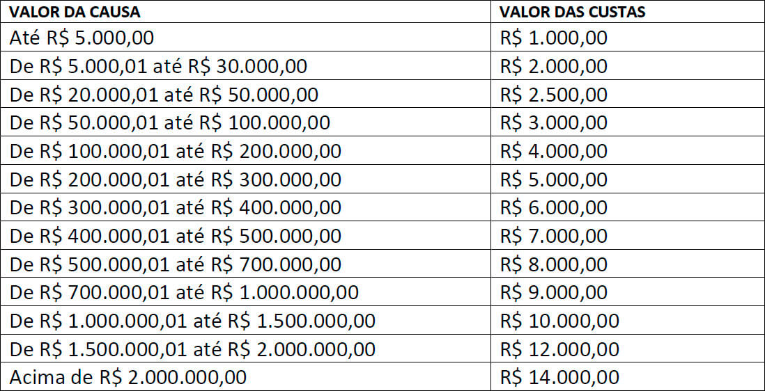 Pagamento das custas deverão ser efetuados através de transferência bancária em nome de: